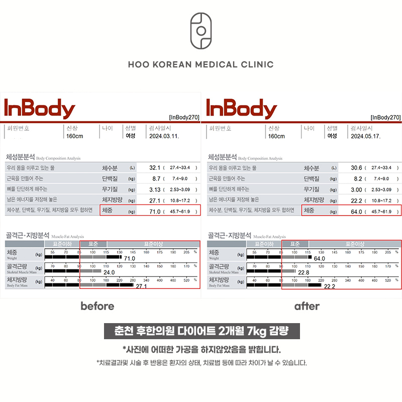 춘천 후한의원 다이어트 2개월 전, 후입니다.총 7kg 감량에 성공하셨습니다. 의료진의 섬세한 진료와 치료를 확인해보세요!문의_033.242.7510카톡_후한의원춘천점오시는길_춘천 금강로 68-2,5층